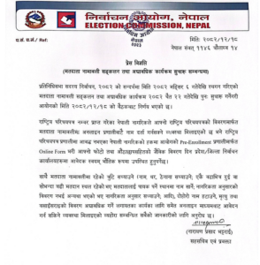 निर्वाचन आयोगका अनुसार, मङ्सिर ६ गतेदेखि स्थगित गरिएको मतदाता नामावली अद्यावधिक कार्यक्रम अब चैत २२ गतेदेखि पुनः सञ्चालन हुनेछ।
