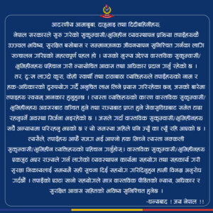 “वास्तविक सुकुम्वासी/भूमिहीनहरू एकजुट भएर राज्यले गर्न लागेको व्यवस्थापन कार्यमा सहयोग तथा सहकार्य गरी सुरक्षा निकायलाई समयमा सही सूचना दिई सहयोग गरिदिनुहुन हामी विनम्र अनुरोध गर्दछौँ”, प्रहरी प्रधान कार्यालयद्वारा आज जारी अपिलमा उल्लेख छ ।