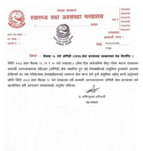 काठमाडौँ। स्वास्थ्य तथा जनसंख्या मन्त्रालयले भोलि (वैशाख १८ गते) देशभरका सरकारी अस्पतालहरूमा ओपिडी सेवा नियमित रूपमा सञ्चालन गर्न सम्बन्धित निकायलाई निर्देशन दिएको छ ।